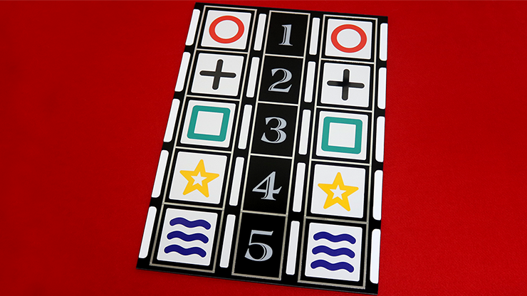 For this trick the magician uses a transparent perspex board, five E.S.P. cards with blue backs and five E.S.P. cards with red backs. Every blue backed card has a matching red backed card. You will have the same E.S.P. symbols on the faces of these cards. The magician slips the blue cards into their slots on the board in an order only he knows. The spectator chooses one by one, in which matching slot the red cards should go, but he only sees the back of the cards. When the magician turns the board around, the blue back and red back cards are in the same order (top to bottom). You can show the trick twice and the order of the cards won't be the same. The cards are not specially prepared.