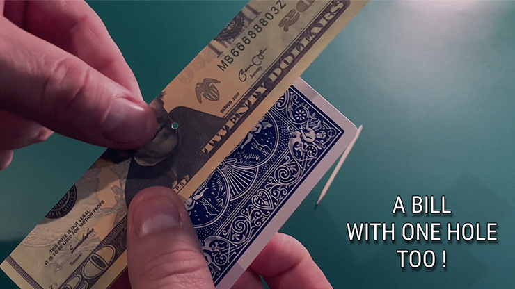 Using the toothpick, pierce the bill right through! The card is now trapped in the ticket!