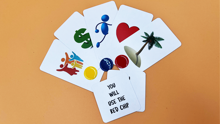 Here's what happens: One colored marker chip is chosen (red, yellow, or blue) and placed on any one of five cards which represent the topics of concerns that people make decisions on every day: Travel, Love, Health, Money, and Family.