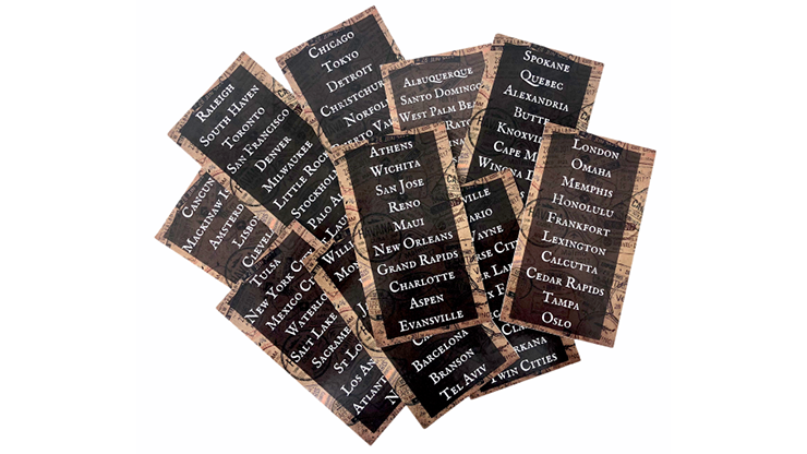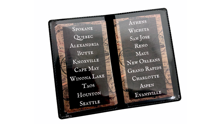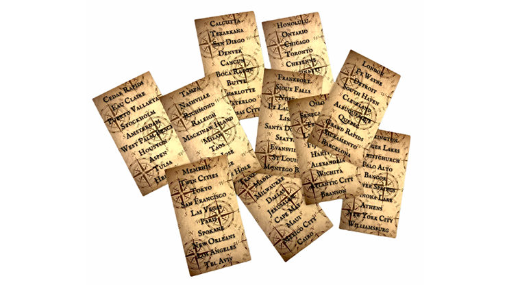 A spectator is told to select a city from a group of 100. He is allowed a totally FREE choice. There are ten cities on each of ten cards. He merely points to the card which has his city on it. He then turns his card over , without seeing the card. He mixes the cards and lays them out on the white side. Once again he finds his city. When he points to the card with his city, you INSTANTLY know which city he selected.