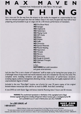 Max Maven traveled from Hollywood to Lake Tahoe. He brought NOTHING but a nice suit. On the way from the airport to the studio, he stopped at a supermarket for less than ten minutes and spent less than ten dollars. Once in his room, he spent less than half an hour preparing, and proceeded to go on stage and do a 50-minute performance of mentalism. Featuring Eugene Burger, Brandon Combs, Gene Matsuura, Stephen Minch, Jan Rose and Michael Weber.