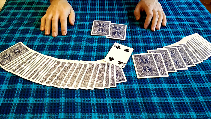A freely selected card is shuffled back into the deck which is then ribbon spread widely across the table. With a fast sweeping movement of his hand across the spread cards, the magician manages to pull the selection instantly out of the middle of the deck.