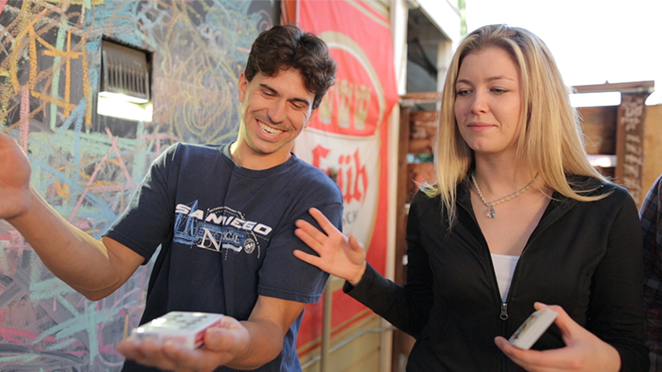 Two decks are presented to two spectators. One open pack of blue cards and one sealed deck of red ones. The sealed deck is placed within one of the spectators hands, the other spectator selects a card from the open pack, moments later the selected card has now vanished from the open pack and impossibly appears inside the cellophane of the sealed deck!