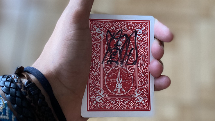 Two signatures slowly disappear off the back of a playing card. The card with the signatures is now found in the impossible location of your choice!