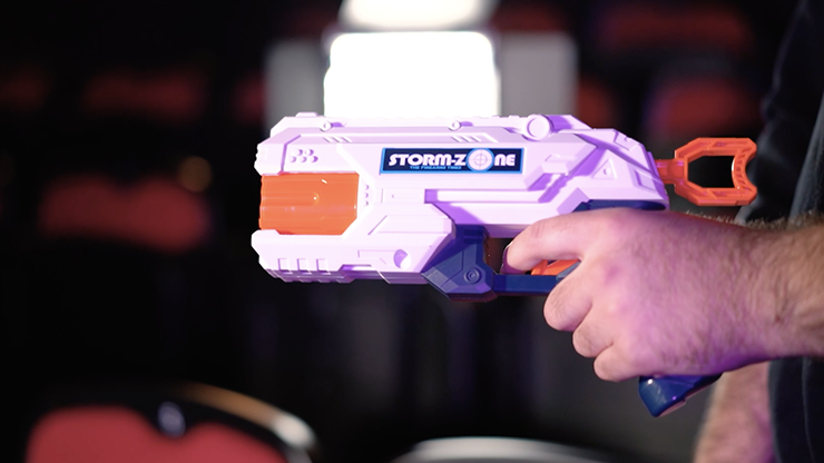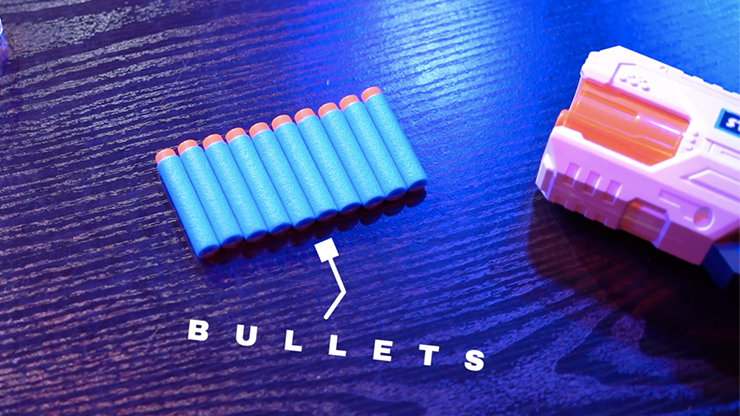 You introduce a Nerf gun and a foam bullet, which is signed by one of the spectators. Now, a second spectator introduces the signed bullet inside the Nerf Gun and he rolls the drum in order to lose the signed bullet.