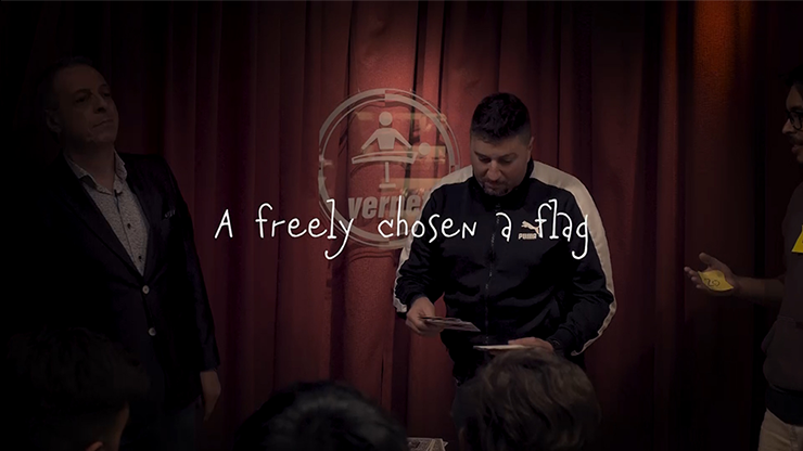 The envelope is opened and a box of jumbo cards with different printed flags on the faces is removed. Another spectator selects, in a crystal-clear way, one of the "flag cards." Tom holds the "flag card" in his left hand. The spectator who chose the "flag card" looks into the box and he finds an envelope with child drawings. The magician says, "Today my son arrived from school and gave me this envelope." Inside, there's a drawing of Tom with the same number held in his hand, the same letter on his chest and the same "flag card" in his hand. Everything matches!