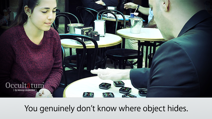 And yet, without the use of electronics or magnets, and WITHOUT ASKING THE SPECTATOR ANY QUESTIONS, you are able to guess where the object hides - using the Occultatum™ psychological system.