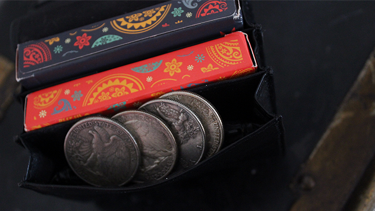 Holds two decks, four half dollars, 4 packet tricks, and business cards