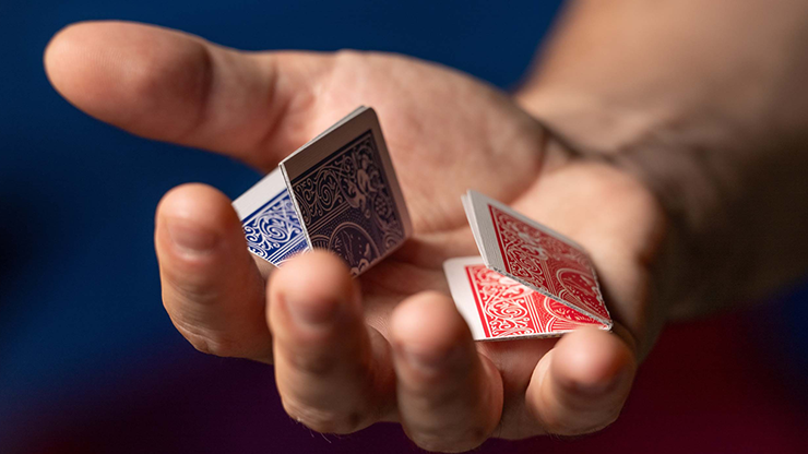 Two cards are removed from a small wallet. one has a red back and one a blue back. Both cards are folded into Quarters. NOTHING IS ADDED or STOLEN AWAY. You SIMPLY FOLD THE 2 SAME CARDS. The cards are placed behind your back and mixed around. The spectator is asked to guess which hand has the RED CARD and which has the BLUE CARD. Obviously, this is just a guess as both cards are hidden in the hands.